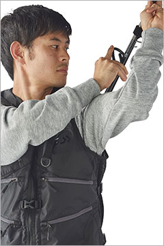 수납공간이 많으면 어깨에 부담을 줄 수 있기때문에 어깨주변에 W러셀 메쉬를 배치했고 카라 부분은 쿠션이 들어간 립 소재를 사용해 수납품의 하중을 분산 시켜 착용감과 무게에 대한 부담을 줄인 베스트다